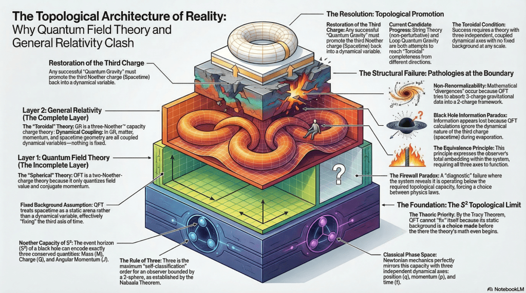 This diagnosis follows from a series of results developed across a broader framework — the Imagination Machine series — that connects the topological constraints on embedded epistemic systems to physics, mathematics, political theory, and the foundations of formal systems. The connection between the black hole’s three conserved quantities, the classical phase space’s three axes, and the minimum condition for stable self-correcting systems turns out to be the same result at different scales. Three is the topological capacity of the spherical boundary. Physics at every scale is organized by this capacity. The incompatibility of QFT and GR is what happens when one theory honors it and another discards one of its charges.